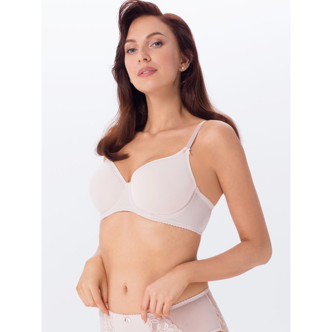 Определить размерГладкий бюстгальтер с формованной чашкой "спейсер" на каркасах. Чашки бюстгальтера выполнены по современной технологии "спейсер", главной особенностью которого является уникальная текстура, позволяющая свободно проходить воздуху сквозь чашку бюстгальтера, благодаря чему кожа может свободно дышать в течение дня. В боковой части чашки присутствует уплотнитель из хлопкового трикотажного полотна. Стан бюстгальтера выполнен из гладкого эластичного полотна, обладающей усиленной упругостью, что обеспечивает надежную поддержку груди. Несъемные бретели, регулируемые по высоте, украшены бантиком.