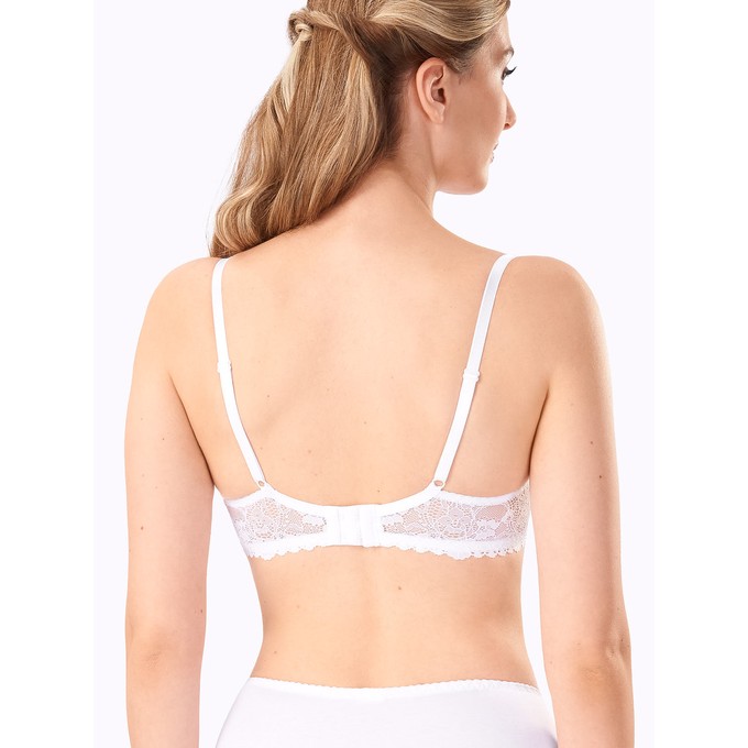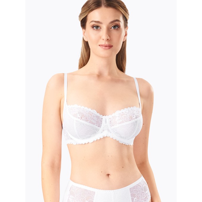 Определить размерБюстгальтер из широкого эластичного кружева, на каркасах. Нижние части мягкой чашки на подкладке из эластичного сетчатого полотна. Мягкая изнаночная сторона тесьмы и бретелей. Декор: бантик.