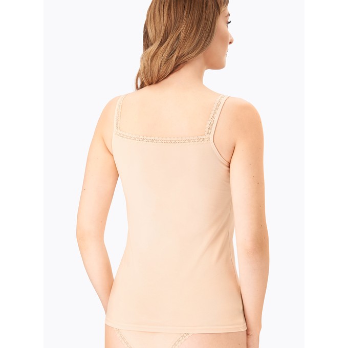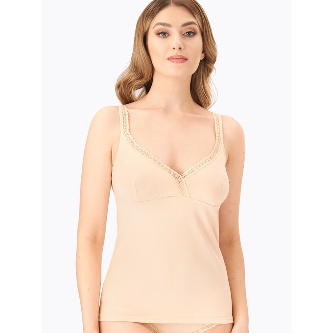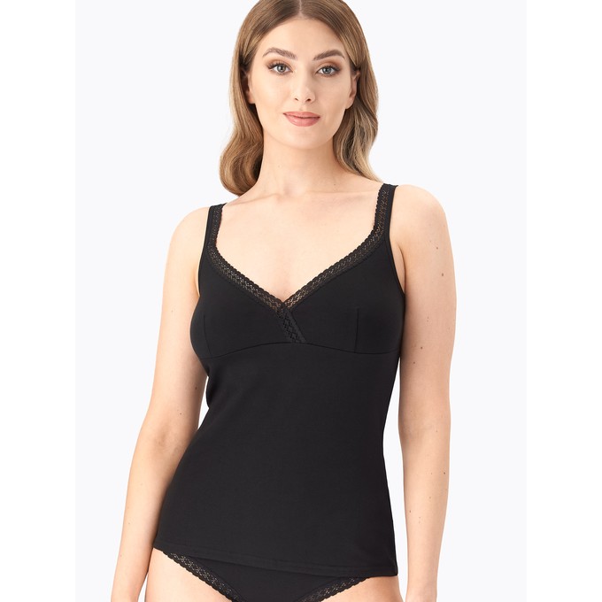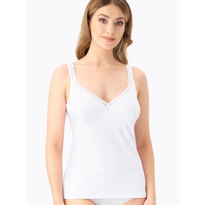 Определить размерМайка из натурального хлопка с лайкрой, прилегающего силуэта. Узкие бретели из мягкой эластичной ленты.Подрез передней детали подчеркивает линию груди. Отделка по верхним срезам переда и спинки из эластичного узкого кружева.