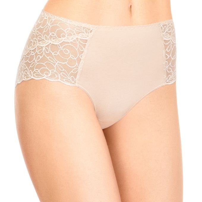 Определить размерТрусы из натурального хлопка с лайкрой с высокой линией талии. Боковая часть выполнена из эластичного кружева. Узкая эластичная лента по линии бедер настрочена незаметным плоским швом. Мягкая эластичная тесьма по линии талии.