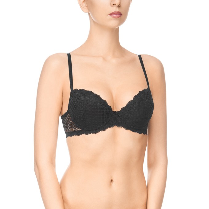Определить размерБюстгальтер «пуш-ап» из широкого эластичного кружева, на каркасах. Формованные чашки с хлопковой изнанкой. Мягкая изнаночная сторона тесьмы и бретелей. Декор: бантик.