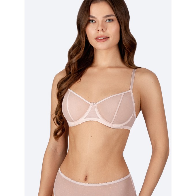 Определить размерБюстгальтер с мягкой чашкой на каркасах изготовлен из эластичной полупрозрачной сетки с изысканным принтом горошек. Мягкая чашка имеет вертикальные членение, которое повторяет изгибы груди и обеспечивает комфортную посадку чашки. Каркасы оказывают хорошую поддержку груди, делая ее более полной и округлой. Изнаночная сторона тесьмы и бретелей бюстгалтера мягкая и приятная к телу. Бретели регулируются по длине. Ширина бретели зависит от размера бюстгальтера, чем больше размер и полнота, тем шире бретель. У бюстгальтера в качестве декоративного элемента присутствует маленький бантик спереди по центру изделия. Удобный, дышащий, сексуальный и красивый мягкий бюстгальтер подходит для повседневной носки, для торжественных случаев, как свадебное белье, бюстгальтер для небольшой груди, бюстгальтер для пышной груди. Белье подходит как для офисного стиля, так и для вечернего образа.