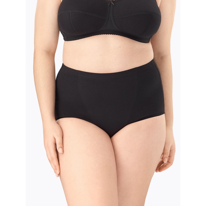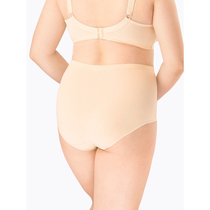 Трусы из натурального хлопка с лайкрой с высокой линией талии. Дополнительный уплотнитель из хлопка корректирует область живота. Мягкая эластичная лента по талии. Ластовица и узкие эластичные ленты по бедрам настрочены незаметным плоским швом.