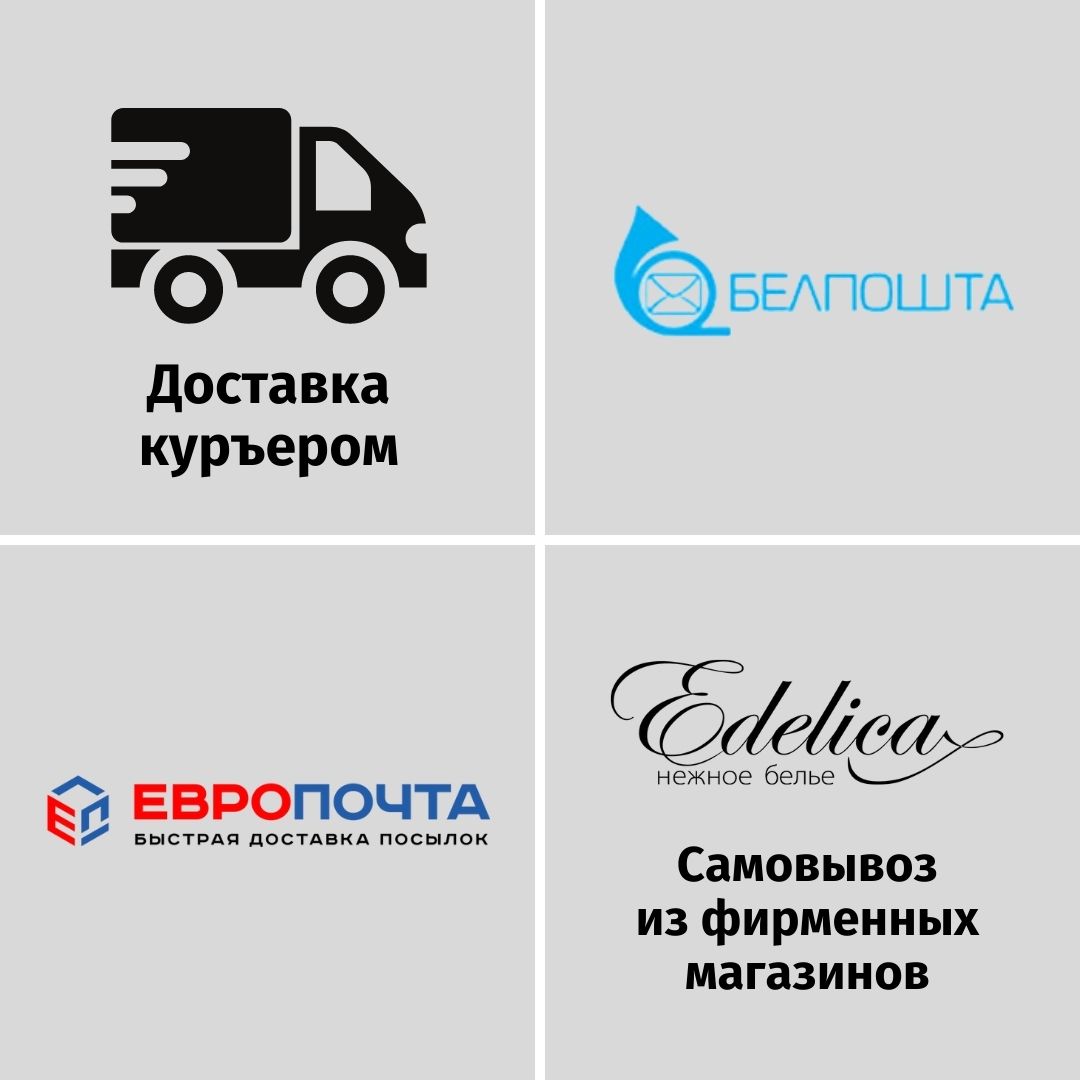 Доставка нижнего белья Edelica осуществляется четырьмя способами: курьером на дом, в отделениях РУП «Белпочта», в отделениях службы доставки «Европочта» и самовывозом из фирменных магазинов Edelica. Покупатель может выбрать тот формат, который будет удобен именно ему.